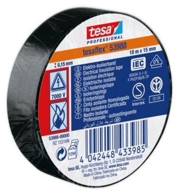 tesa® 53988 er en elektrisk isolasjonstape med svært høy klebekraft, som er enkel å håndtere og slipper rullen jevnt. Denne fleksible isolasjonstapen består av et mykt bæremateriale og en klebemasse av naturgummi. Den er vanskelig antennelig, aldersbestandig og værbestandig, stort sett upåvirket av myknere og sertifisert i henhold til IEC 60454-3-1 (VDE, IMQ, SEMKO).