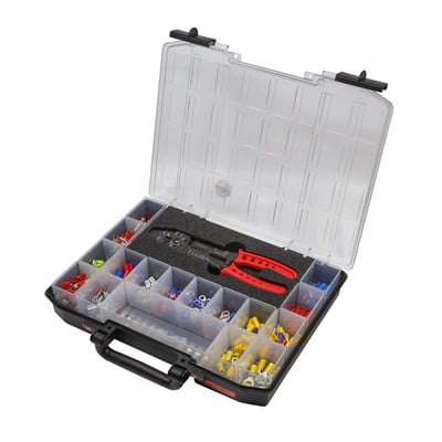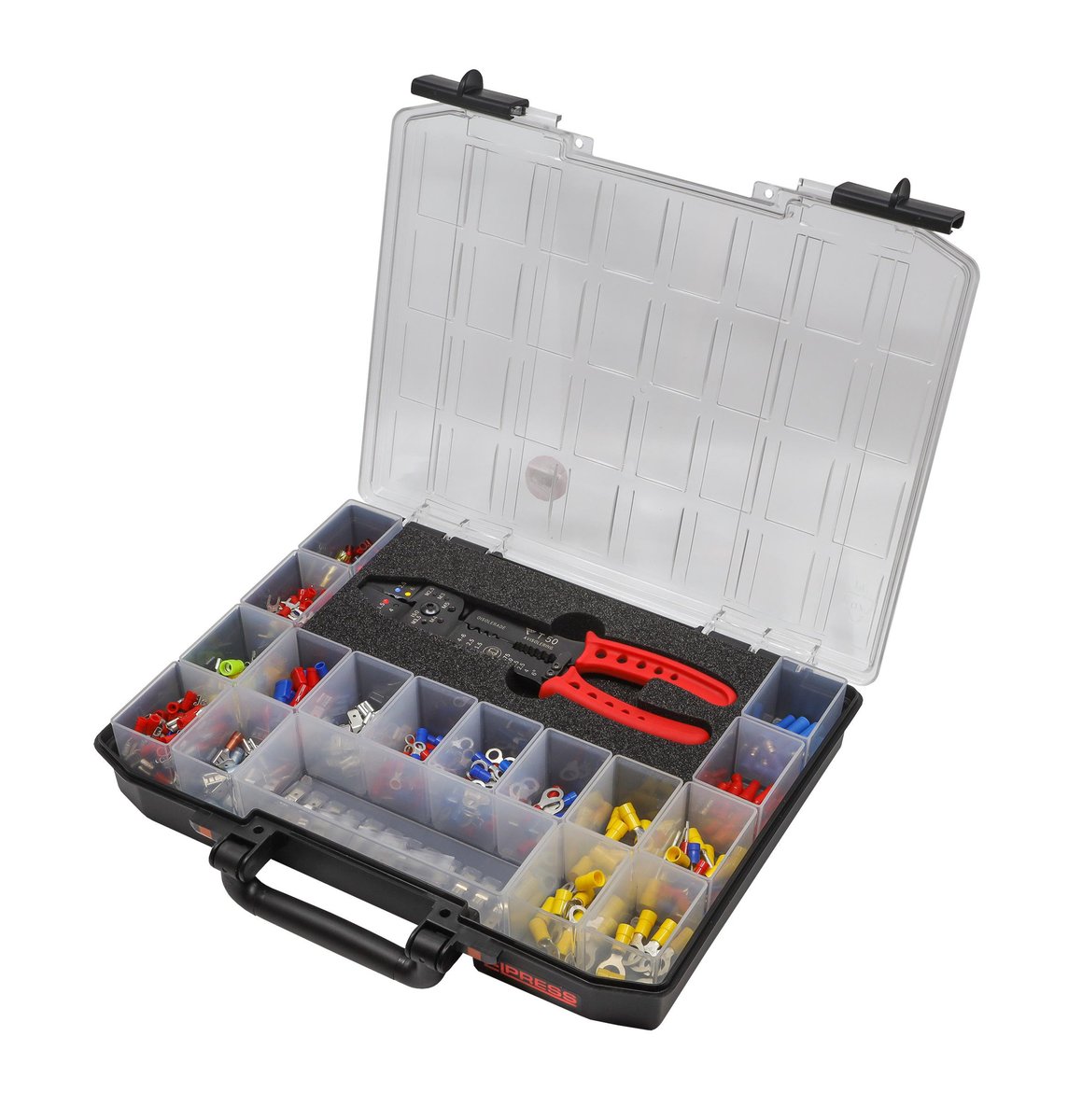 Sett med pressverktøy T50, 346 isolerte forbindelseselementer (0,5-6 mm²) og 3 koblingslister. Leveres i polypropylen-plastkasse med 11 rom.