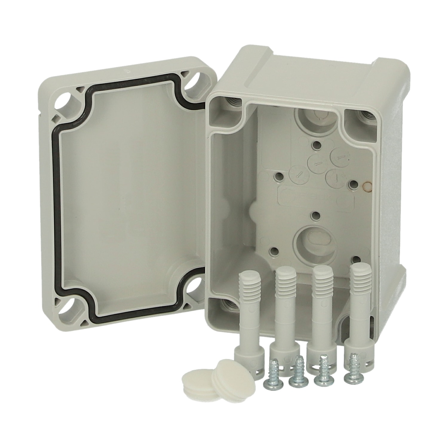Kassen er utstyrt med en PUR pakning som sikrer en tett lukking. Det grå dekselet er produsert av polyamid og har innvendige hengsler, noe som gir en holdbar og funksjonell løsning for oppbevaring av elektriske komponenter.