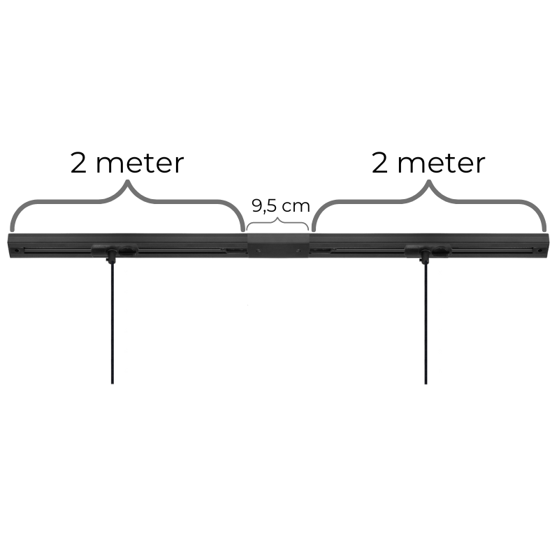 85. Diagram af Nordtronic Square lampeskinne med dimensioner, der viser to 2-meter sektioner forbundet med 9,5 cm midtertilslutning.Square lampeskinne for nedhengte lamper (pendler), til 2 lampe, sentertilkobling, svart, 4 meter