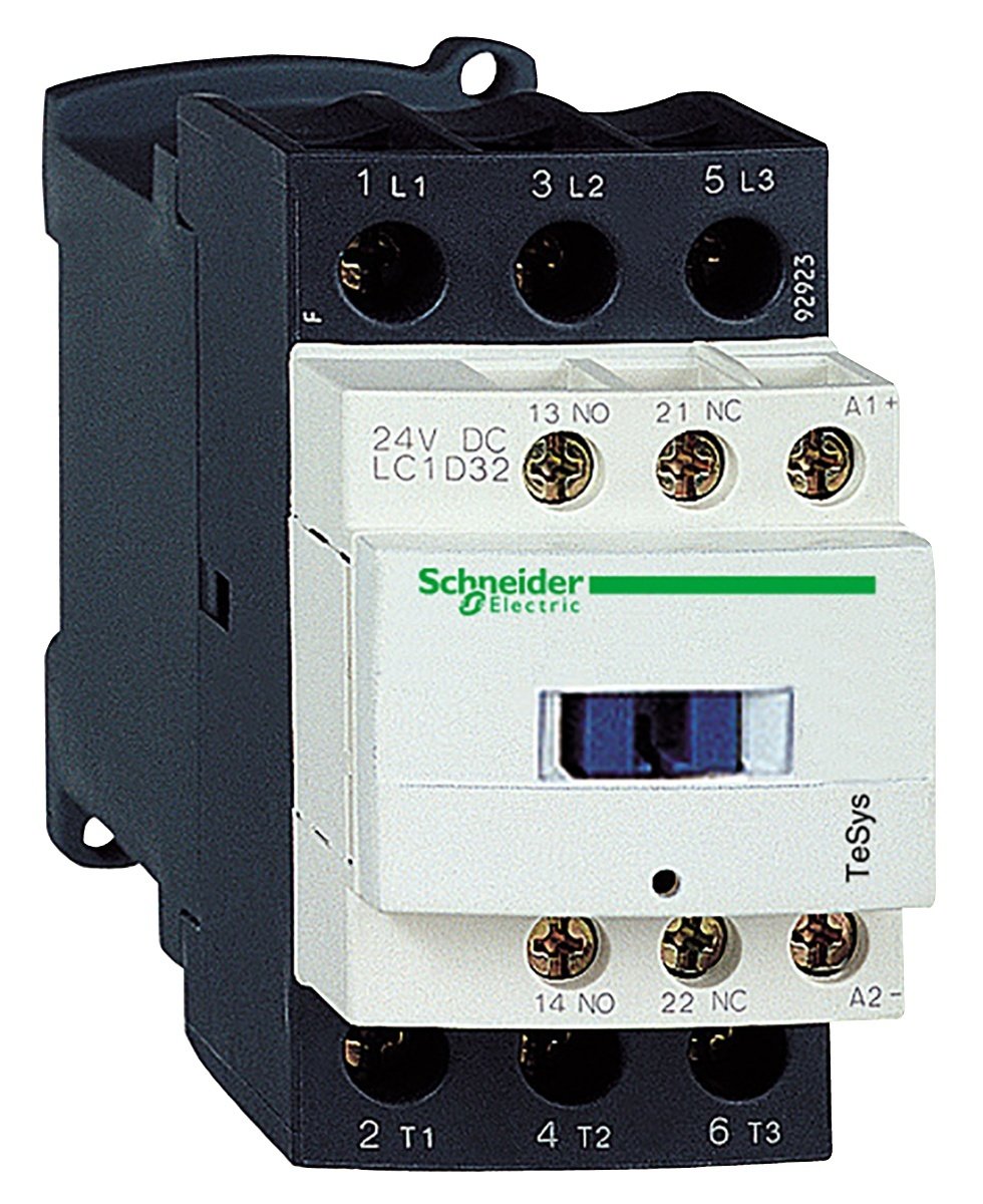 Kontaktorer og reverseringer TeSys serie D 9_150 A Kontaktor for motordrift og for ikke-induktive belastninger LC1-D. Typenr: LC1Dxx, hvor xx står for merkestrømmen og .. For spenningskoden. Det er alltid i TeSys-kontaktorer 1sl + 1 br. Merkestrømmen i AC3 drift, 440V: fra 9 til 150 A. Max. merkeeffekt for 3-fasede standardmotorer i AC3 380/400V: fra 4 til 75 kW. Max strøm i AC-1 drift, 3 og 4 polige kontaktorer: fra 25 til 200 A. Clipsbare hjelpere, se under tilbehør. Spolespenninger: AC fra 24V til 660V; DC fra 12V til 440V. Skruløse klemmer: legg til et 3-tall før spenningskoden, for eksempel: LC1D123B7: 12A 24 VAC kontaktor med skruløse klemmer. Andre spenninger er det viste utvalget på forespørsel.