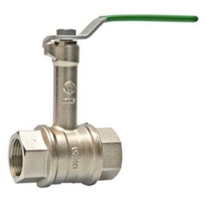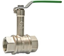 Kraftig kuleventil med lang hals og fullt gjennomløp. Avsinkningsfri messing med TEA overflatebehandling. Muffe/muffe. Grønt stålhåndtak.