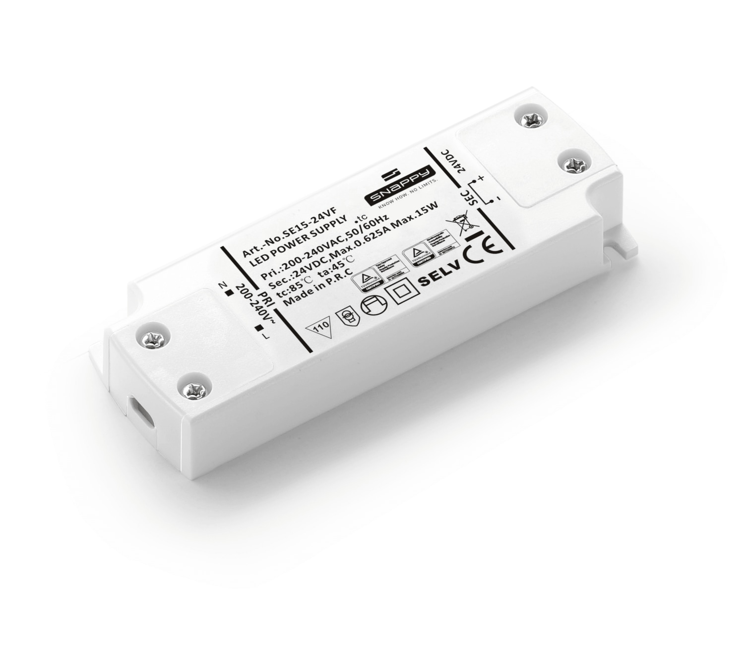 Snappy super slim SE15-24VF (Tidligere SNP12/15-24VF-D) er en 16 mm høy CV LED-driver med ekstrem lav byggehøyde og enkel installasjon. Driveren er uten dimming og perfekt egnet for små LED-strips.
