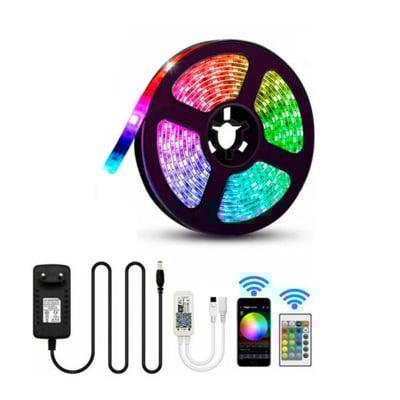 WiFi app-styrt komplett LED stripe på 5 meter. Enkel å montere med dobbeltsidig bakside. Det følger også med fysisk fjernkontroll. LEDstripen kan også brukes på baderom med stripens IP-klasse 65