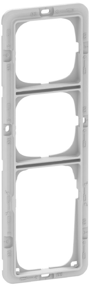 LK FUGA Choice designramme 3½ modul med et transparent ydre lag og udskiftelige farveindlæg i blå, sort og hvid.Teknisk monteringsramme til LK FUGA Choice designramme med 3½ modul, fremstillet i hvid plast og med markeringer for montage.