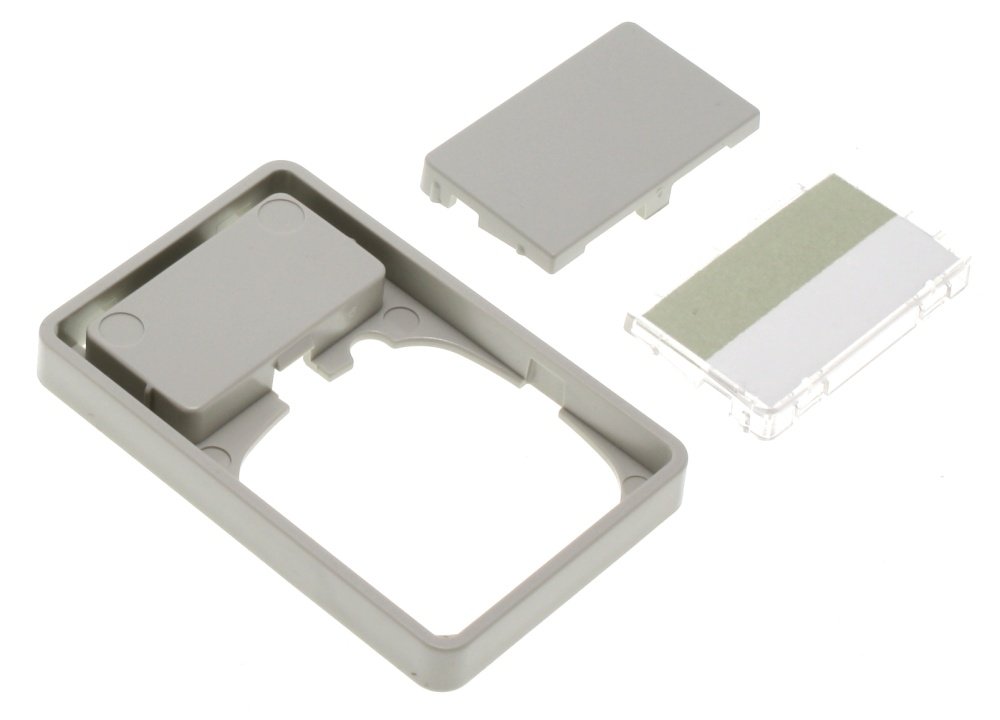 LK FUGA Baseline 50 ramme i lysegrå med tekstfelt og plads til et modul, viser den gennemsigtige afdækning til tekstfeltet.Adskilte dele af LK FUGA Baseline 50 ramme i lysegrå, inklusive rammen, en grå afdækning og en gennemsigtig plade til tekstfeltet.Teknisk illustration af LK FUGA Baseline 50 ramme i lysegrå, der viser dens dimensioner og monteringsdetaljer.