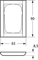LK FUGA Softline 63 ramme til 1½ modul indsats, hvid plast med afrundede kanter.Isoleret LK FUGA Softline 63 ramme set skråt fra siden, fremviser den hvide overflade og bløde kanter.Teknisk tegning af LK FUGA Softline 63 ramme, der viser proportionerne og udskæringen til indsatsen.Skematisk illustration med målinger for LK FUGA Softline 63 ramme, viser dimensioner 63mm bred, 90mm høj og 8,5mm dyb.