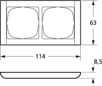Hvid LK FUGA Softline ramme med 2 moduler vandret placeret på hvid baggrund.Vinklet billede af hvid LK FUGA Softline ramme, der viser dens afrundede kanter og to modulåbninger.Skematisk tegning af hvid LK FUGA Softline ramme med 2 modulåbninger og monteringsdetaljer.Teknisk tegning af LK FUGA Softline ramme, der angiver dimensioner: 114mm bred, 63mm høj og 8,5mm dyb.