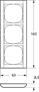 Anvendes på innmuringsbokser og veggbokser. Kan ikke brukes på utvendige underlag. Rammen er 1 modul i bredden og 3 modul i høyden. Den kan kun brukes loddrett og har plass til 3 stk. 1 modul innsatser.