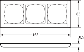 LK FUGA Softline 63 vandret ramme i hvid med plads til tre 1-moduls indsatse, vist fra en let vinkel.Nærbillede af LK FUGA Softline 63 rammen, der viser de afrundede kanter og tre åbninger til el-indsatse.Teknisk illustration af LK FUGA Softline 63 rammen, der viser de tre udskæringer til indsatse og monteringsdetaljer.Målsat tegning af LK FUGA Softline 63 rammen, der angiver dimensionerne 163 mm i bredden og 63 mm i højden.