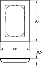 LK FUGA Softline 68 ramme i hvid plast, 1½ modul bredde og 1 modul højde, med afrundede kanter.Vinklet billede af LK FUGA Softline 68 ramme i hvid plast, 68 mm bred, viser den afrundede profil.Teknisk skitse af LK FUGA Softline 68 ramme, visuelt der viser mål på 96x68x8,5 mm.LK FUGA Softline 68 ramme i hvid, med en 1½ modul indsatsåbning, der viser monteringsdetaljer.