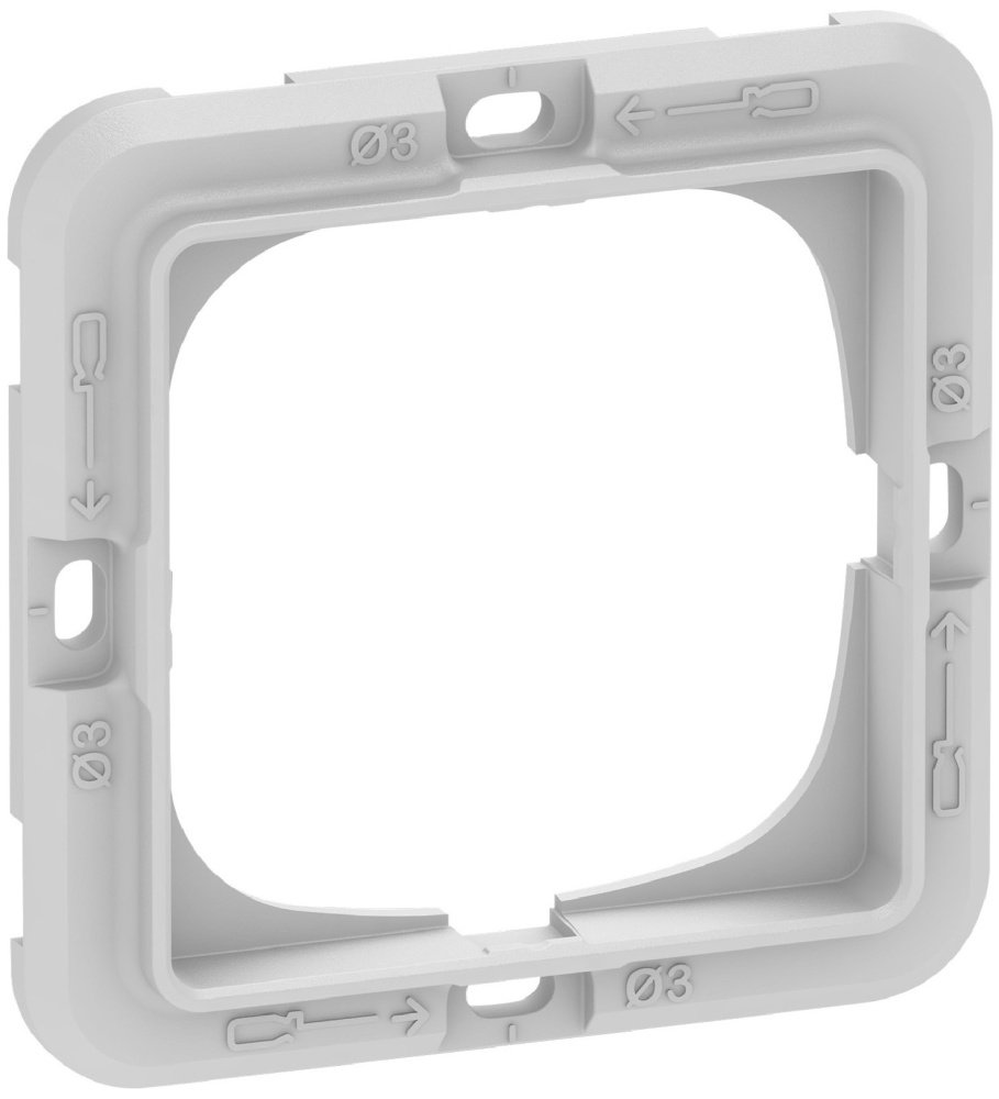 LK FUGA Soft 63 designramme i stålmetallic med et åbent modul til montering af el-udstyr.Teknisk monteringsramme til LK FUGA Soft 63 i hvid plast, med markeringer for 63mm indbygningsdåser.