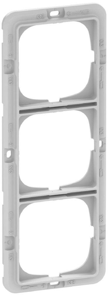 LK FUGA Soft 63 lodret design ramme i koksgrå med plads til tre moduler, vist på hvid baggrund.Teknisk monteringsramme til LK FUGA Soft 63, hvid, med markeringer for installation og tre modulåbninger.