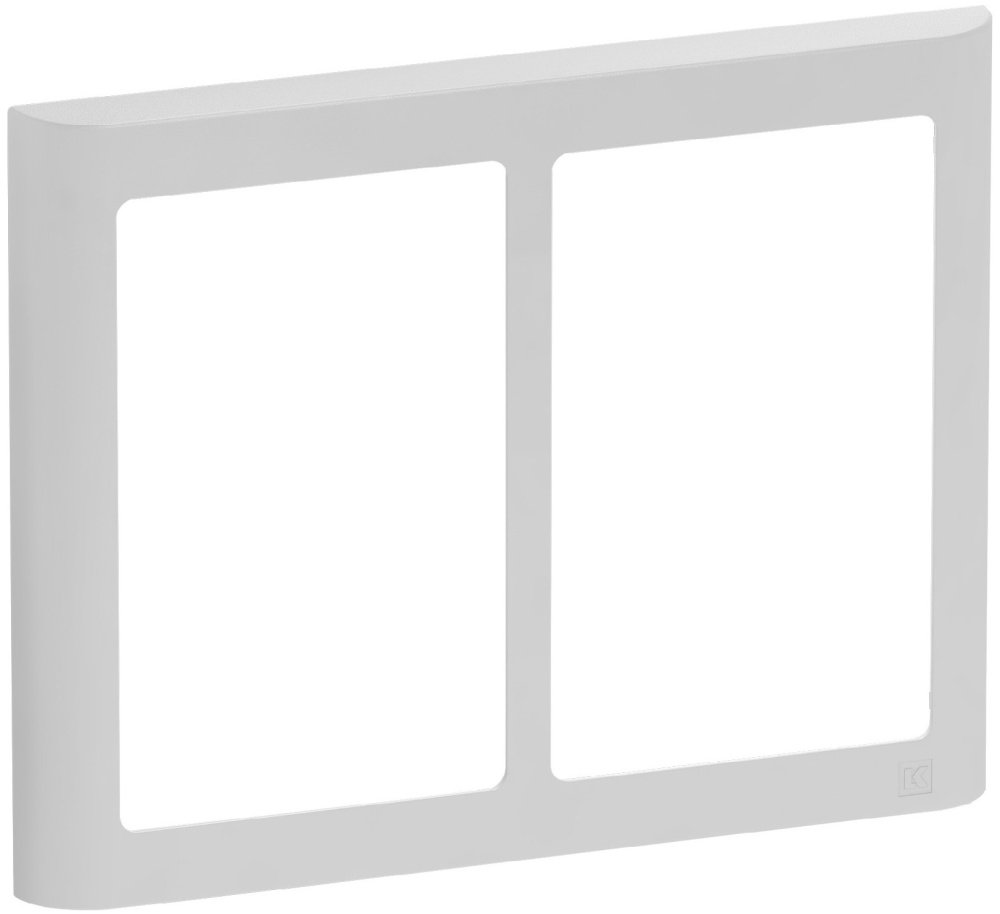 1. LK FUGA Soft 63 designramme i lysegrå til 2 moduler lodret med et enkelt LK logo i nederste højre hjørne.LK FUGA – Soft 63 loddrett designramme, 2 modul, lys grå + teknisk monteringsramme
