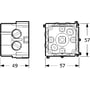 Fremstillet i termoplast med stor formstabilitet. Ved sammenbygning af dåser, hvor rammer skal stødes, skal afstandsstykker imellem dåserne anvendes. Er forsynet med ribber henholdsvis skydespor for sammenbygning. Har en dybde på 49 mm. og kan indbygges ryg mod ryg i en 100 mm. væg. Rørtilgange: Hver ende har 2 stk. 16 mm, siderne har 1 x 16 mm. + 1 x 20 mm. og bunden har 1 x 16/20 mm. 4 skruetårne i bunden, for hhv. lodret og vandret montage.