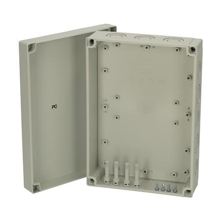 Robust monteringsboks i slagfast polykarbonat med IP66/67 kapslingsgrad og grått deksel. Ideell for krevende miljøer.