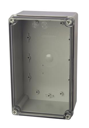 Montasjeboks med transparent deksel, PUR pakning og skruer. Ideell for monteringsplate eller DIN-skinne.