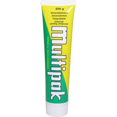 Pakksalve fra Unipak. Multipak kan brukes til bl.a. fittings og rør til gass, vann, varme, kjøling og trykkluft. Skal brukes med passende pakkegarn. Letter senere demontering av rør og fittings.