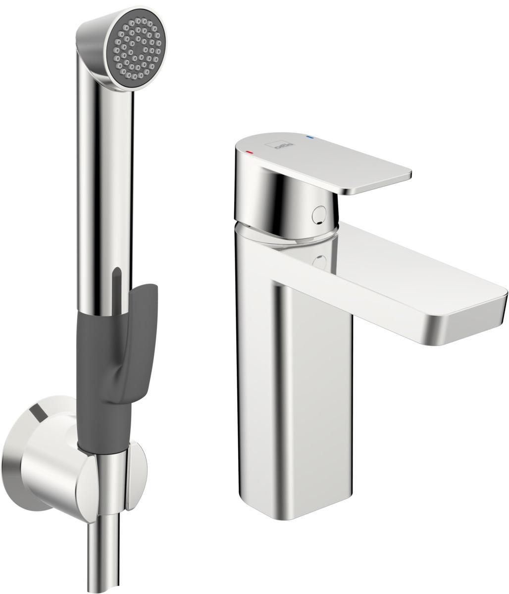 Servantbatteri med fast tut og Bidetta hånddusj. Justerbar lufter for å forhindre vannsprut. Leveres med fleksible tilkoblingsslanger.