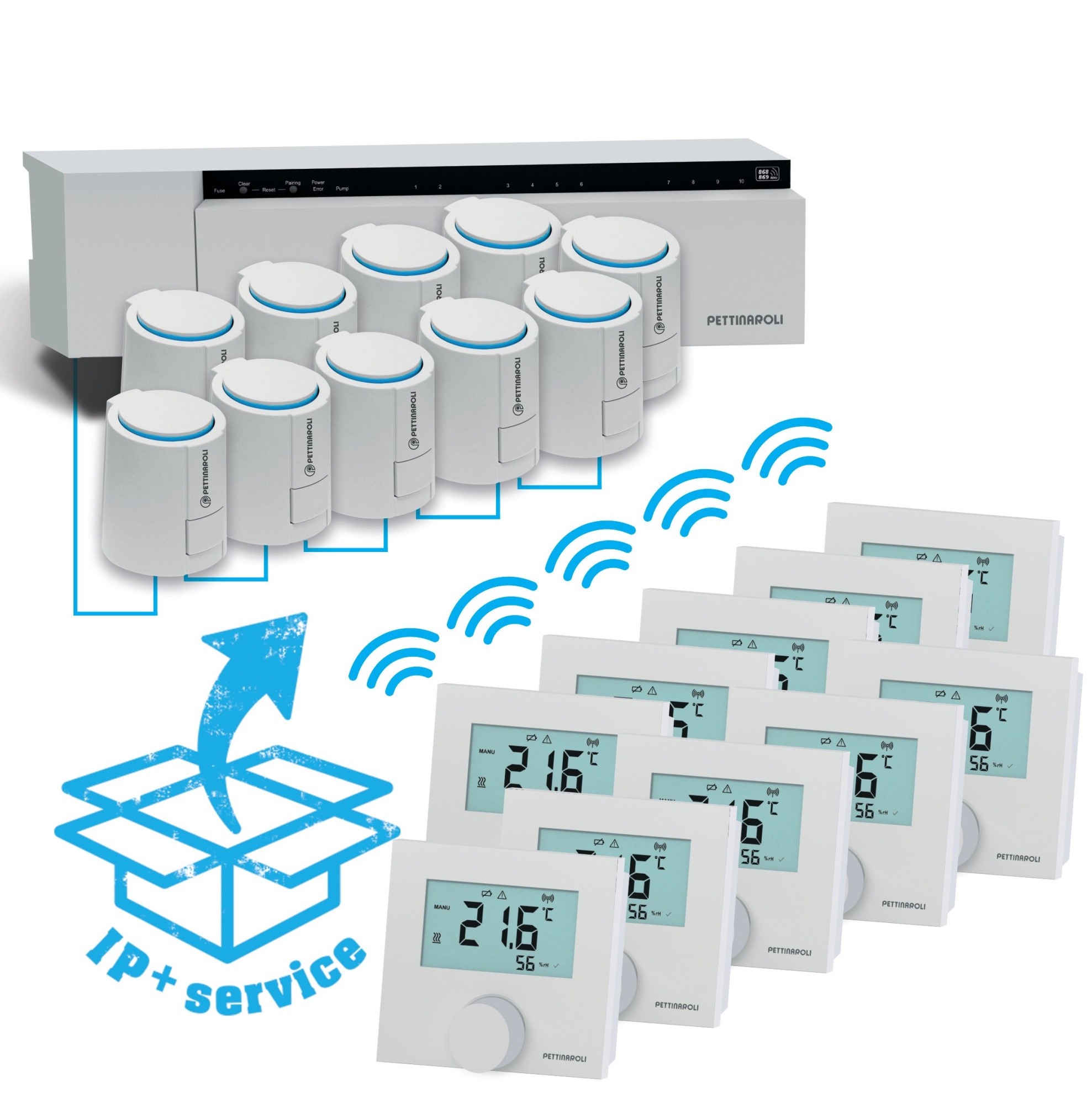Komplett trådløs gulvvarmestyring for 10 kurser. Romtermostater er innkodet og telestater montert i styreboks.
