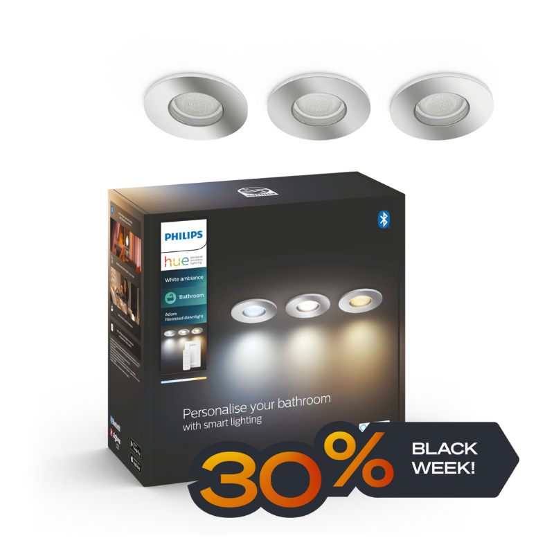 Philips Hue Adore er en serie intelligente lamper til baderommet i Hue belysningssystemet. Disse Downlightene har et slankt design som er den perfekte løsningen for å skape et diskret og moderne uttrykk i belysningen på baderommet ditt.