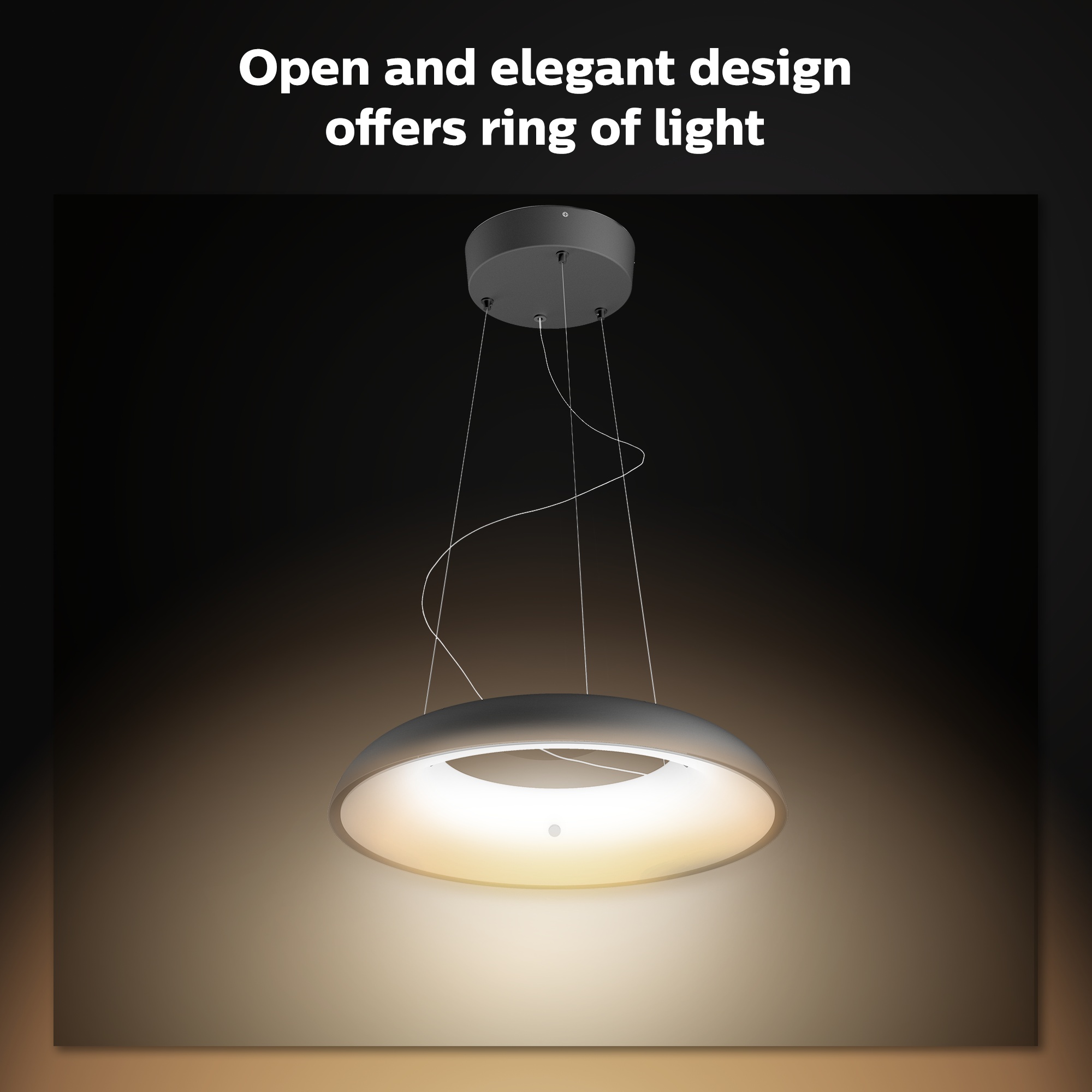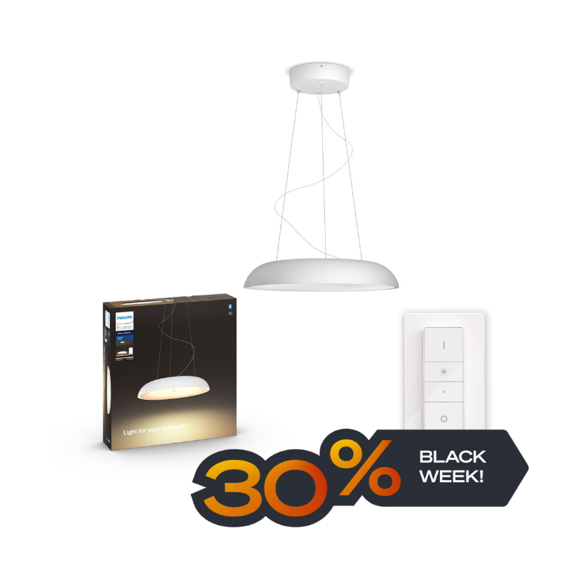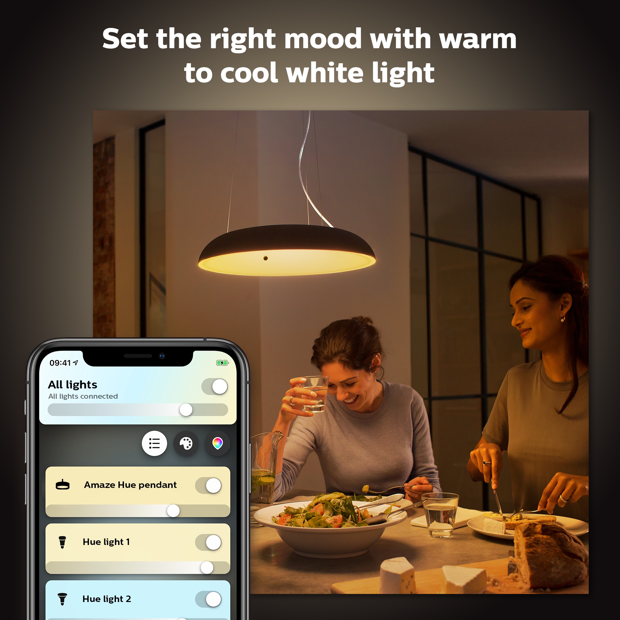 Philips Hue White Ambiance Amaze pendellampen i hvit har et unikt design som passer perfekt inn i alle kjøkken og stuer. Få et naturlig varmt til kjølig hvitt lys med de innebygde belysningsløsningene og den medfølgende Hue Dimmer switch eller via Bluetooth. Legg til en Philips Hue Bridge, og få tilgang til samtlige intelligente belysningsfunksjoner.