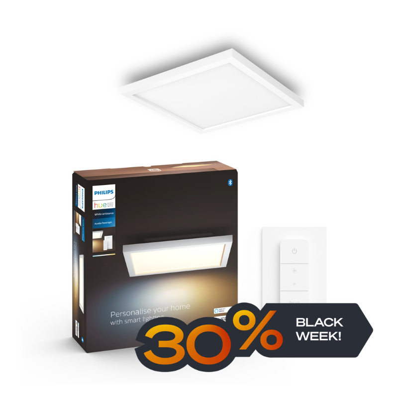 Philips Hue Aurelle lyspanelet tilbyr en fleksibel belysningsløsning med White Ambiance, som gjør det mulig å skifte mellom et varmt til et kjølig hvitt lys. Dette firkantede panellyset er utstyrt med integrert LED og kan enkelt styres via Bluetooth med din smarttelefon eller nettbrett, eller med den medfølgende Hue Dimmer switch.
