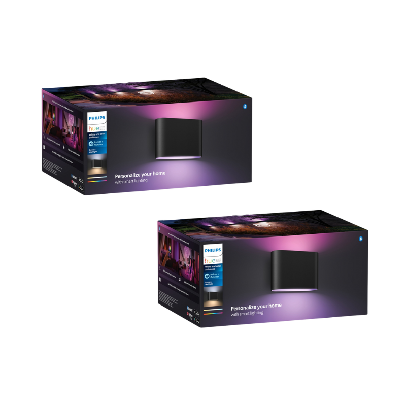 Philips Hue Dymera vegglampe med to lyskilder for intelligent belysning i hvitt og farger. Perfekt for både innendørs og utendørs bruk.