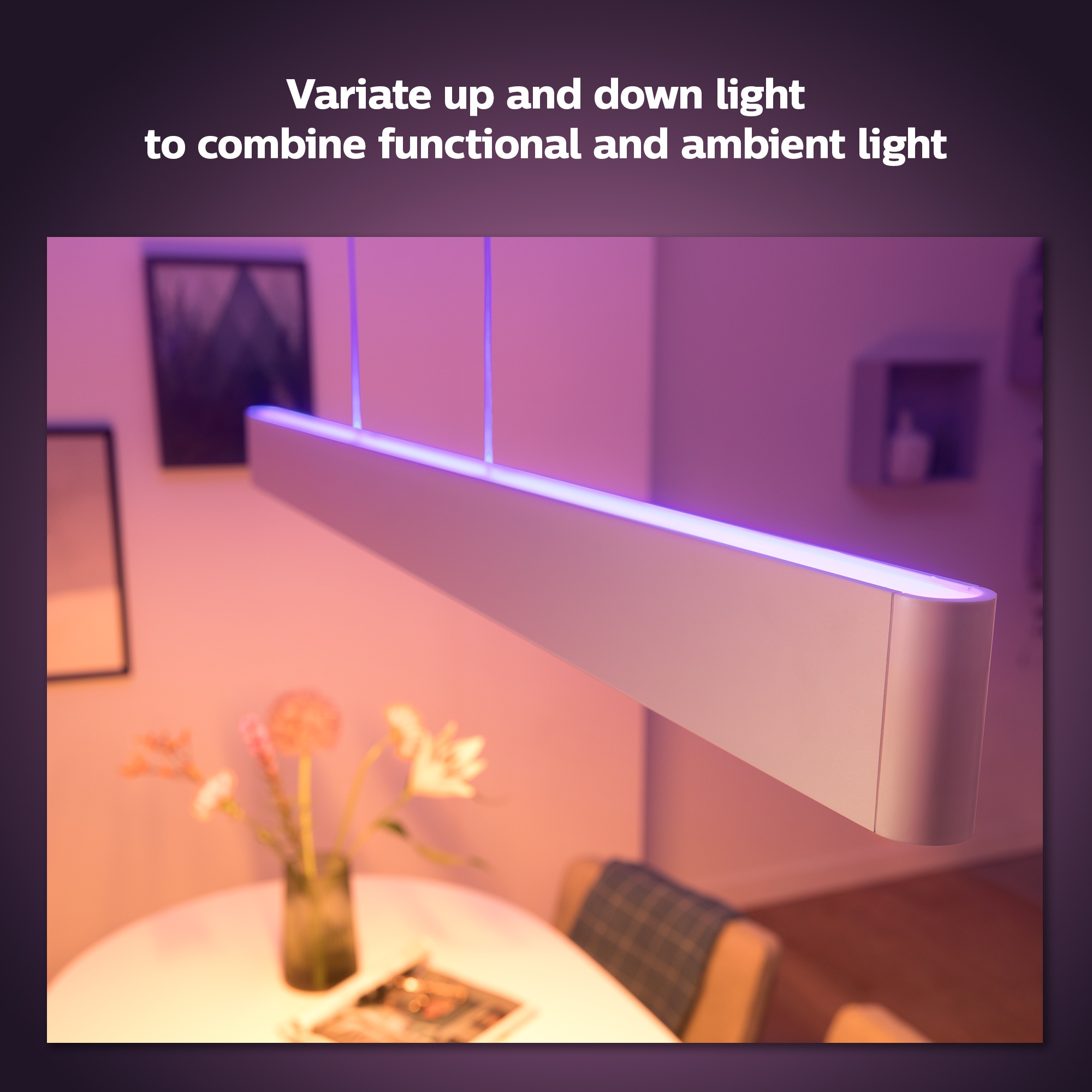 Philips Hue Ensis pendelen kombinerer et slankt design med både oppad- og nedadrettet lys, noe som gjør det enkelt å skape både funksjonell og stemningsfull belysning. Denne pendelen kan brukes alene eller integreres i ditt eksisterende intelligente belysningssystem via Hue Bridge.
