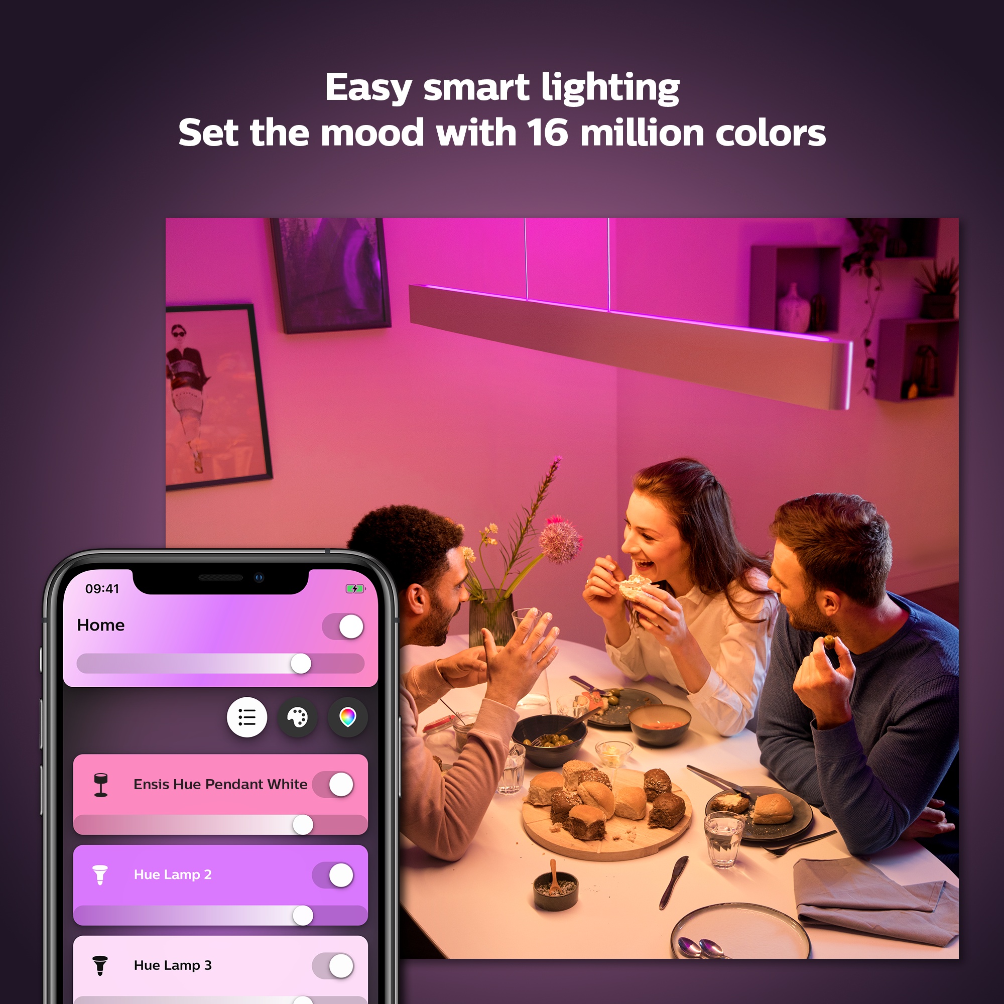 Velg mellom 16 millioner farger og skap den perfekte stemningen for enhver anledning. Fargesett hjemmet ditt og skap den rette atmosfæren med et trykk på en knapp.