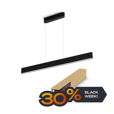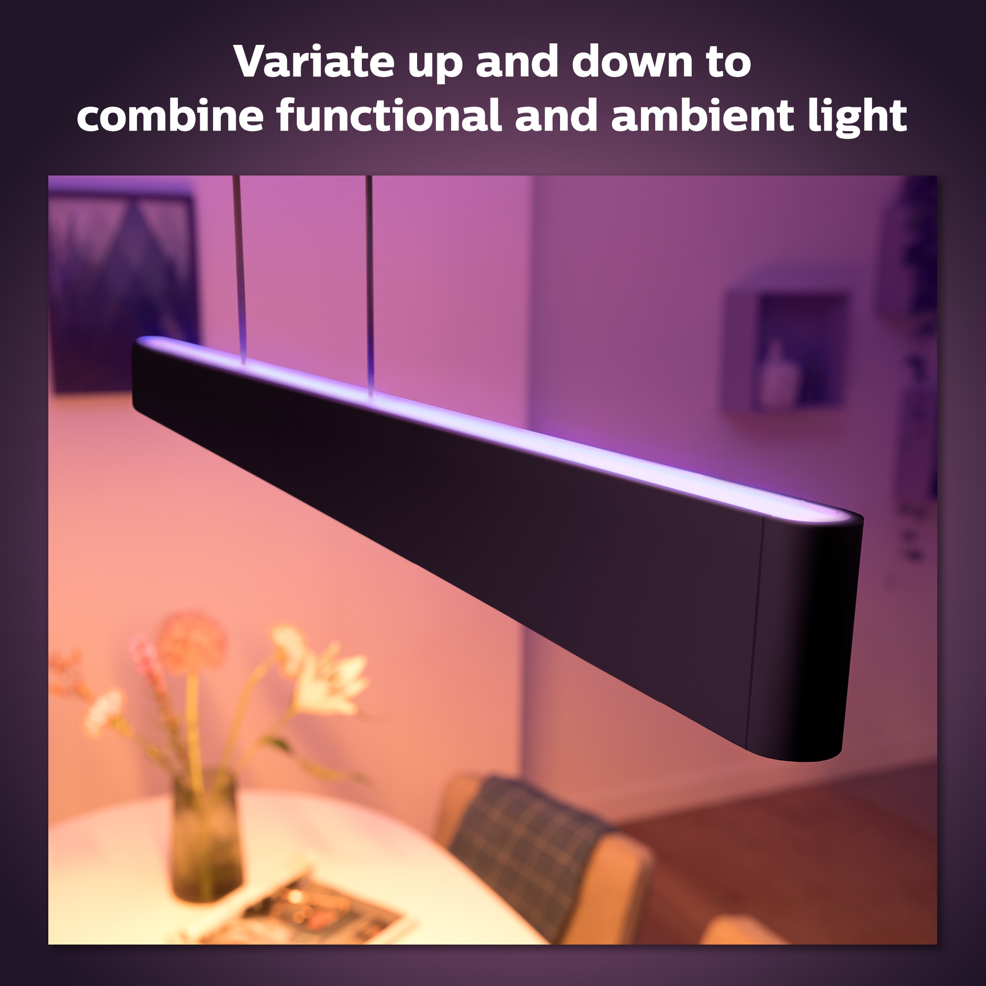 Philips Hue Ensis pendelen kombinerer et slankt design med både oppad- og nedadrettet belysning, noe som gjør det enkelt å forene funksjonelt lys med stemningsfull atmosfære. Lampen kan brukes alene eller integreres i ditt intelligente belysningssystem via en Hue Bridge.