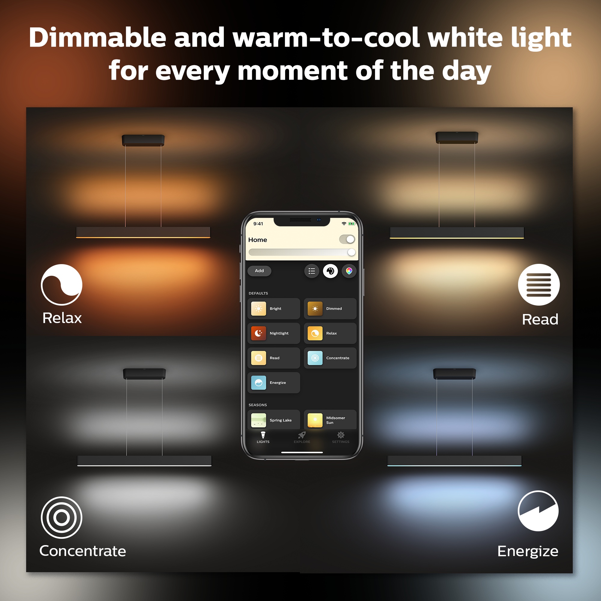 Gjør hverdagen enklere med fire forhåndsinnstilte belysningsløsninger: Få energi, konsentrer deg, les og slapp av. De kjølige nyansene i Energize og Concentrate hjelper deg med å komme i gang om morgenen og bevare fokus, mens de varmere scenene Read og Relax er perfekte for en god bok eller avslapning.