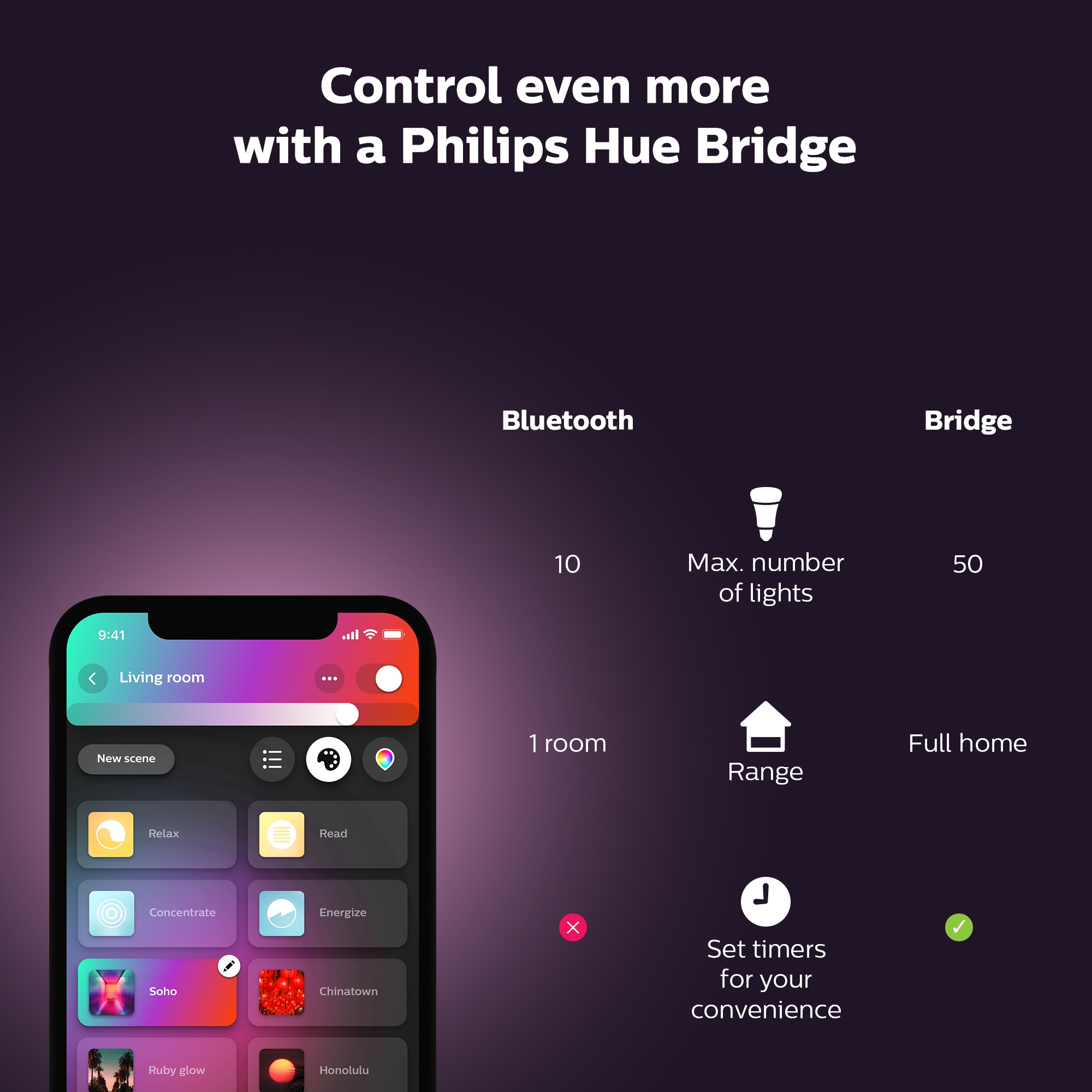Legg til en Hue Bridge (selges separat) til systemet ditt og få tilgang til alle Philips Hue-funksjoner. Med en Hue Bridge kan du legge til opptil 50 intelligente lyskilder og betjene dem overalt i hjemmet ditt. Still inn rutiner for å automatisere belysningen din, betjen lyset når du er ute, eller legg til tilbehør som bevegelsessensorer og intelligente brytere.