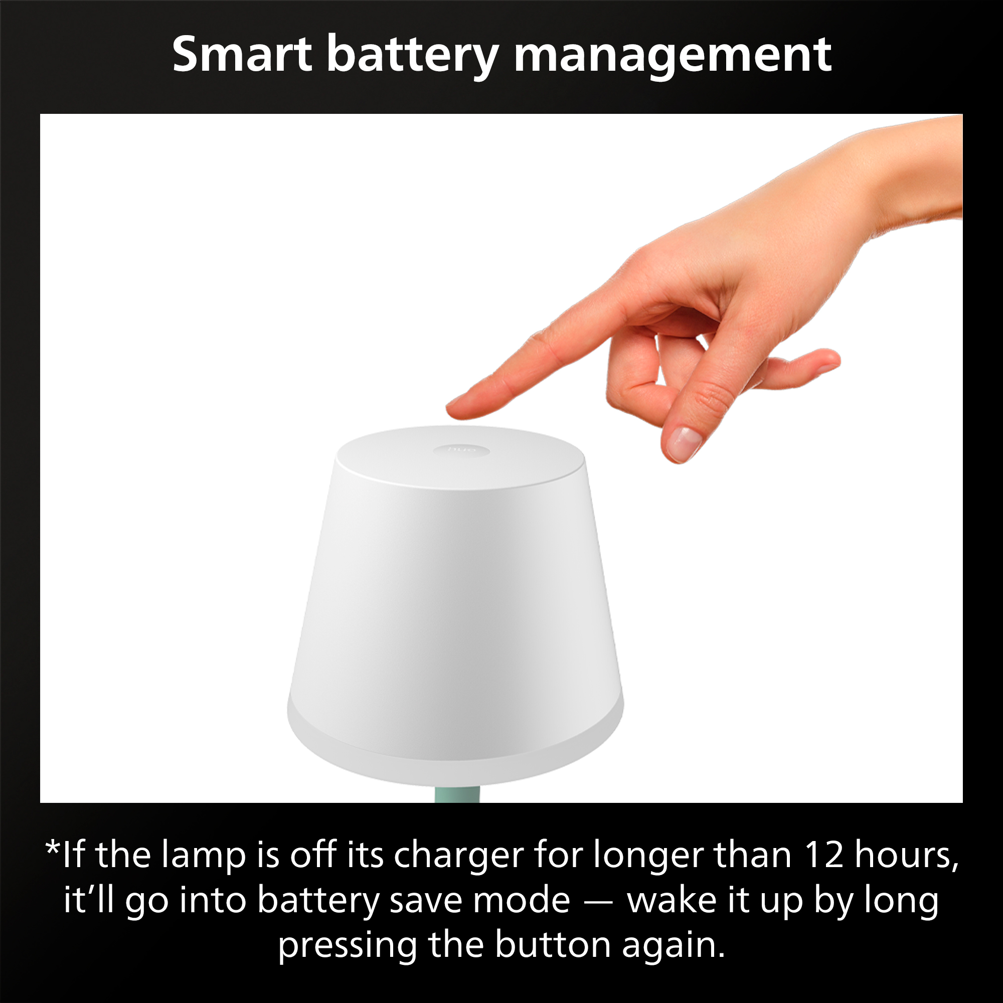 Takket være det innebygde oppladbare batteriet kan du ta den bærbare Hue Go med overalt. Bruk den innendørs til lesing eller utendørs til grillaftener. Få opptil 48 timers lys på en enkelt lading, og lad den enkelt på den medfølgende ladebasen.