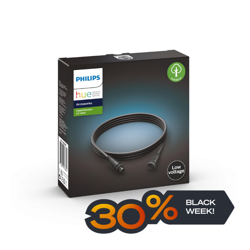 Forleng avstanden mellom din Philips Hue strømforsyning og dine utendørslamper med denne 2,5 meter lange, vanntette skjøtekabelen i svart.