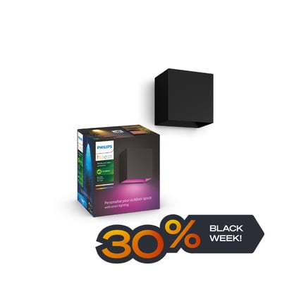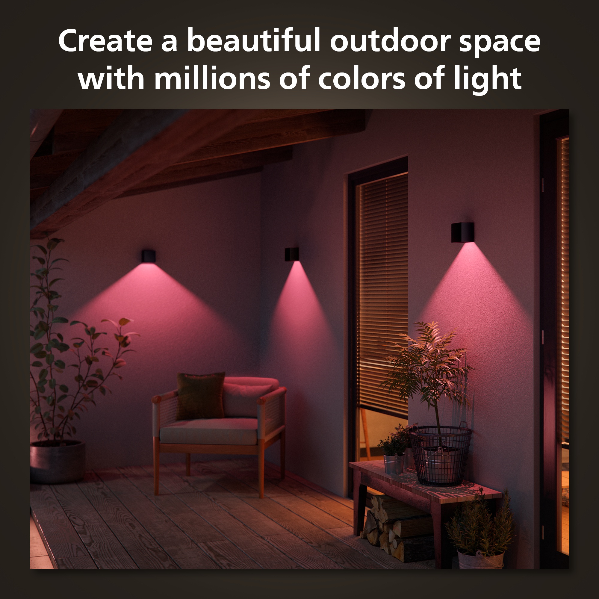 Philips Hue Resonate utendørs vegglampe i svart. Skap stemning med farget lys. Krever Hue Bridge. IP44 godkjent. Mål: 12 x 12 x 9,3 cm.