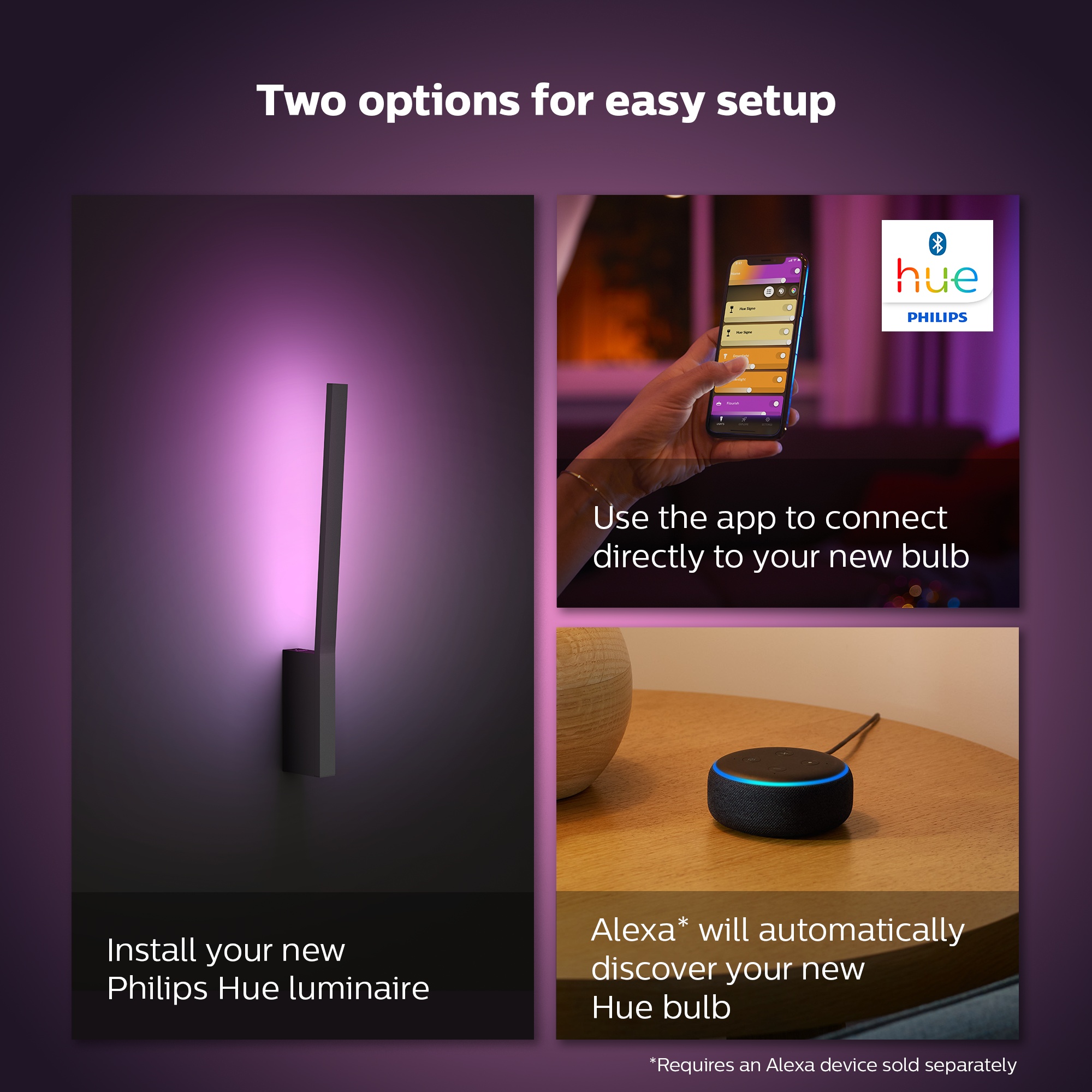 - Philips Hue fungerer med Amazon Alexa og Google Assistant (krever kompatibel enhet)