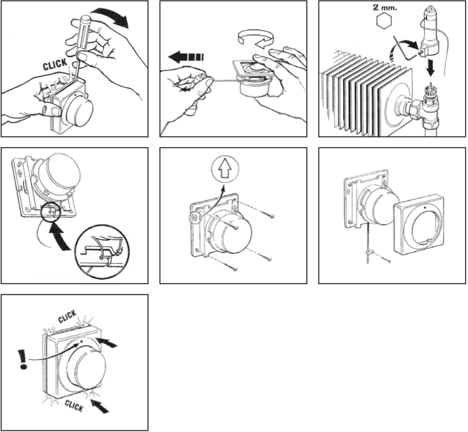 Danfoss RA 5062 fjernindstillings termostat med indbygget føler og 2 meter kapillærrør, hvid, vist med den separate føler ved siden af.Danfoss RA 5062 termostat med drejeskive vist fra en anden vinkel, med den separate føler placeret til højre.Illustration der viser forskellige Danfoss radiatorventiler og termostater, inklusiv RA 2012, RA 2920 og RA 2990.To illustrationer der viser eksempler på placering af en fjernindstillings termostat, en ved en radiator og en højere på væggen.Trin-for-trin illustration af montering af Danfoss termostat med kapillærrør, der viser tilslutning til radiatorventil.Illustreret vejledning til installation af Danfoss termostat, der viser fastgørelse af komponenter og tilslutning af kapillærrør.Illustration af en Danfoss termostat, der demonstrerer tilslutning via klik-mekanisme og justering af temperaturindstillingen.