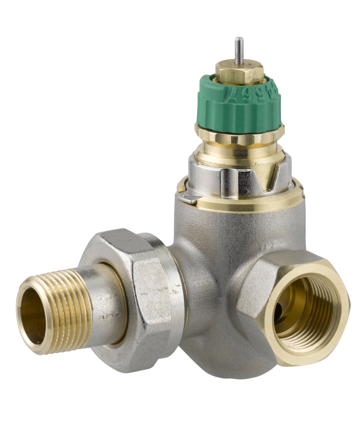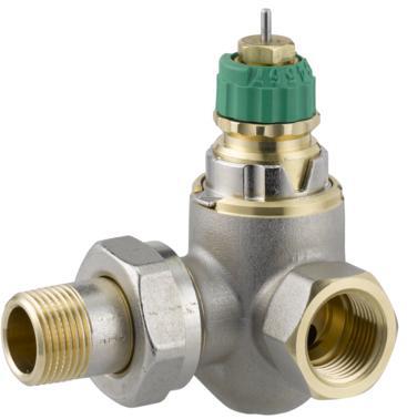 Danfoss RA-DV 10 ventilhus for 2-strengsanlegg. Med innebygd trykkregulator, integrert forhåndsinnstilling og 3/8" tilkobling. Forniklet messing.