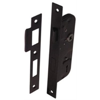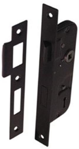 Rex 37 tilholderlås med falle og rigel. Den har en brunlakkert rektangulær stålstolpe og sluttstykke, samt sinklegering falle, rigel og fallrør.