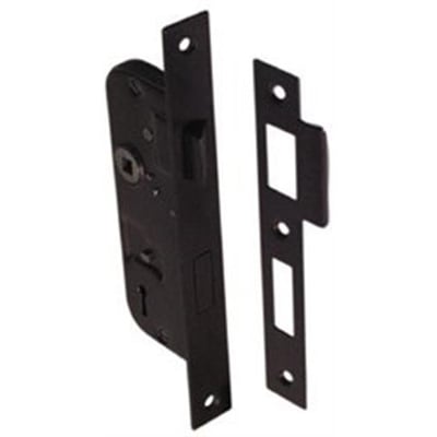Rex 37 tilholderlås med falle og rigel. Brunlakkert rektangulær stålstolpe og sluttstykke. Leveres med 4 forniklede stålnøkler.
