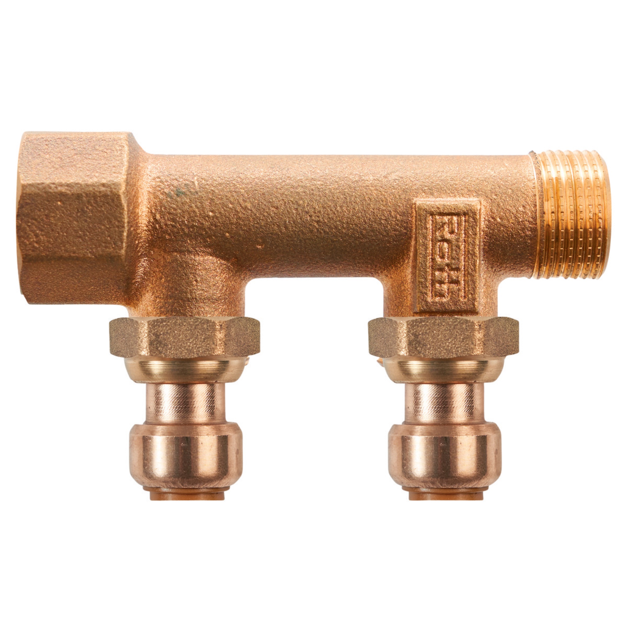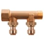 Roth EURO-red fordelerør i rødgods (CC499K) med 2 avgreninger og 15 mm innstikk. Til tappevanns- og varmeinstallasjoner. Leveres med støttehylse i rustfritt stål.