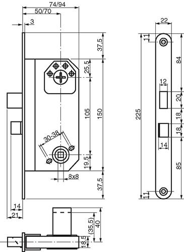 - Dimensjoner: Dornmål 50 mm, dybde 74 mm, stolpelengde 225 mm, stolpebredde 22 mm.