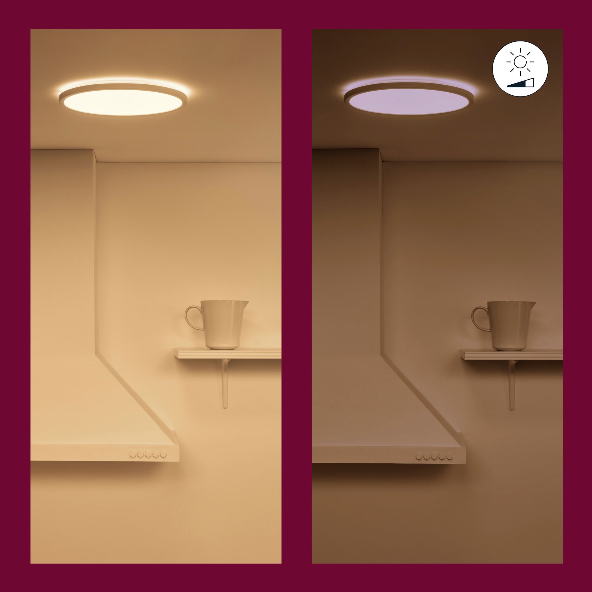 Du vil elske muligheten til å kunne velge mellom et bredt spekter av varmt til kjølig hvitt lys til lampens sentrale lyssone, mens du kan legge til et stemningsfullt preg av personlighet ved å velge din favorittfarge til lampens ring av farget lys.