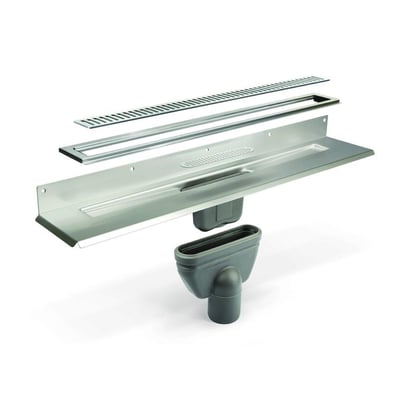 Løsningen er tilgjengelig i lengdene 700, 800, 900 og 1000 mm og som hjørneløsning, og inkluderer: ClassicLine rist (søyle), ClassicLine ramme (H 10 mm), tretut, avløpsarmatur (1004 med bakre flens) og utløpshus (Ø 75 mm vertikalt inkl. vannlås).