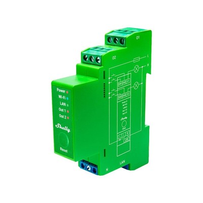 Shelly Pro Dimmer 2PM er en wifi-styrt 2-kanals dimmer for DIN-skinne montering. Kan belastes med opptil 200W LED per utgang og har effektmåling på hver kanal.