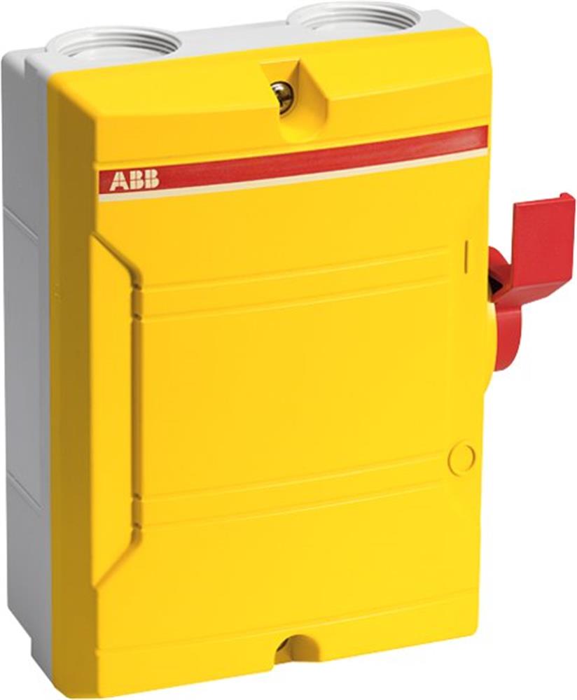 Sidebetjent sikkerhetsbryter i lysegrå boks med gult deksel/håndtak. Brukes for å forhindre start av motorer eller elektriske anlegg under service og ettersyn.