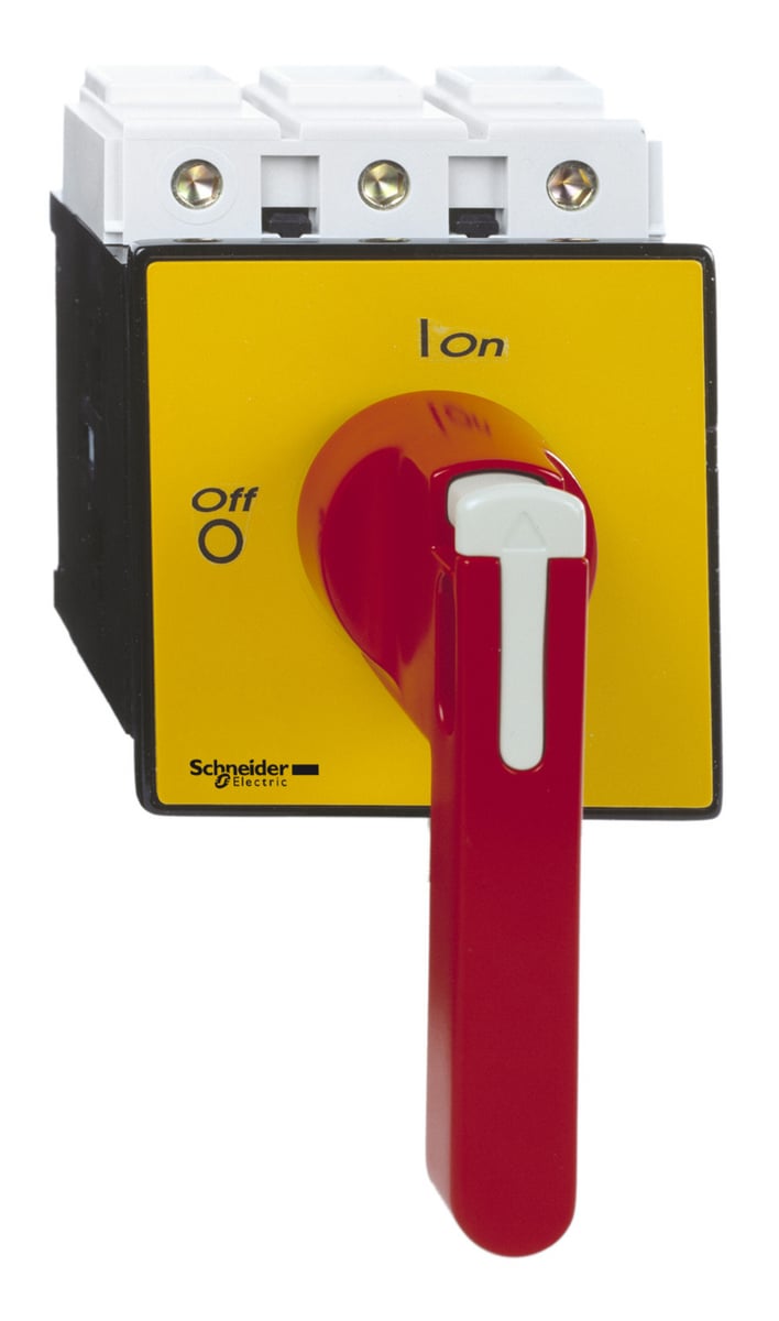 TeSys Vario sikkerhetsbryter fra Schneider Electric med 125A, 3 poler, frontbetjening og rød/gul farge. For frontmontasje.