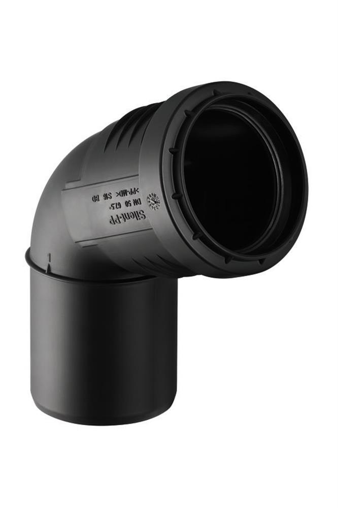Geberit Silent PP bøy for avløpsutløp i bygninger. Lydoptimalisert 3-lags konstruksjon, egnet for innendørs bruk og 2 års utendørs oppbevaring.
