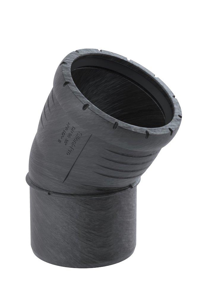 Geberit Silent-Pro bend: 30°, d=110mm. Optimal lyddemping med EPDM-tetning. Denne bend er ideell for utslipp av avløpsvann i bygninger, spesielt de med store krav til lyddemping.